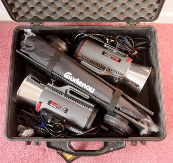Courtenay 1250 studio solaflash kit. Two flash units with modelling lights, stands, umbrella, mains leads, sync leads and solid carry case.